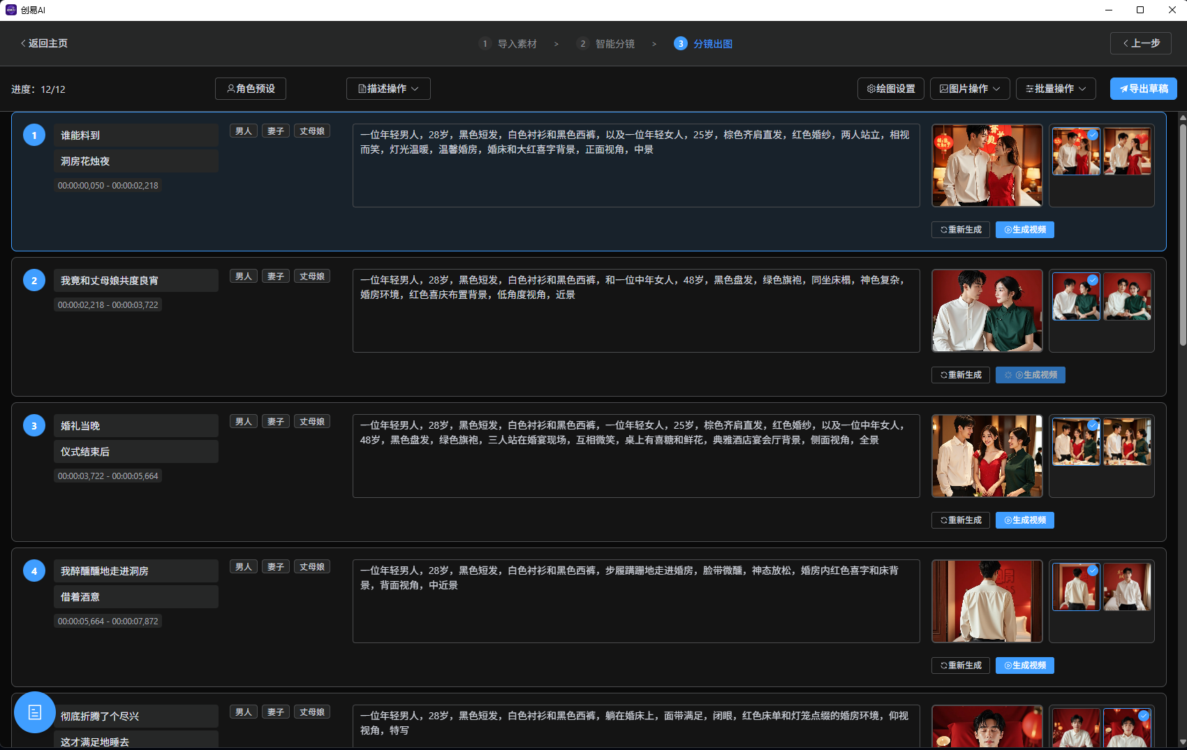 导入小说,AI 自动拆解剧情、分配画面。左侧改字,右侧图,所见即所得,支持批量操作。